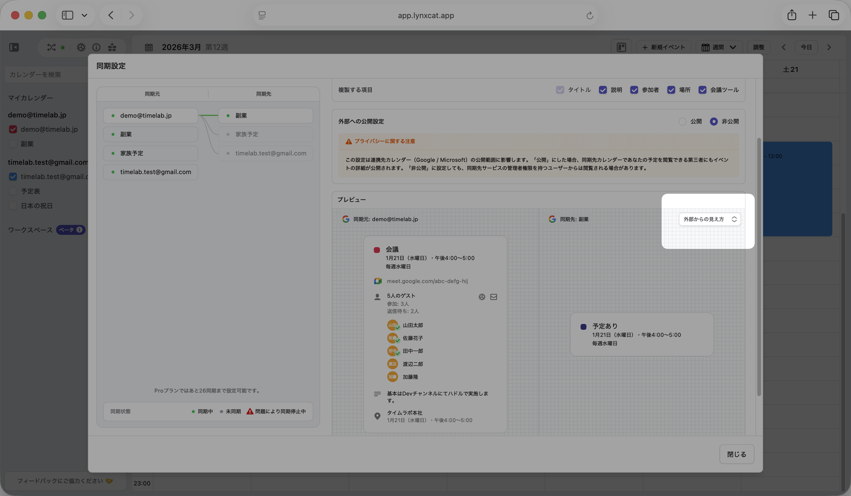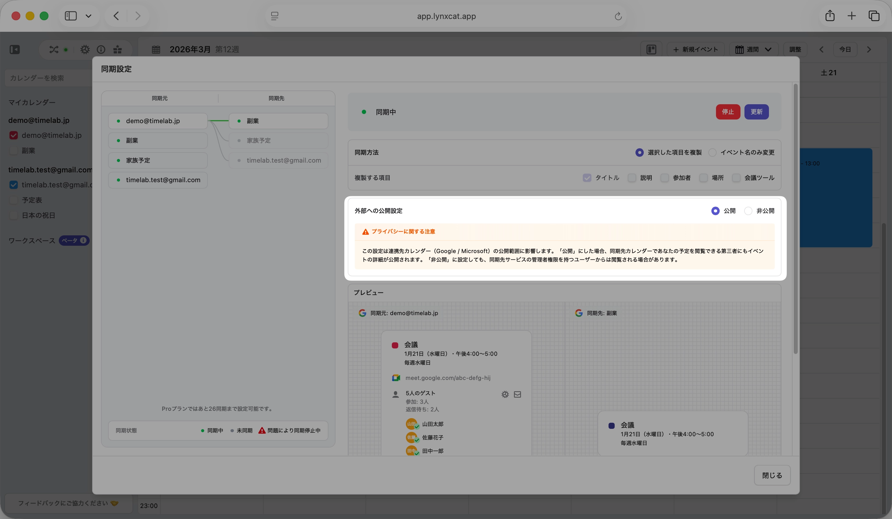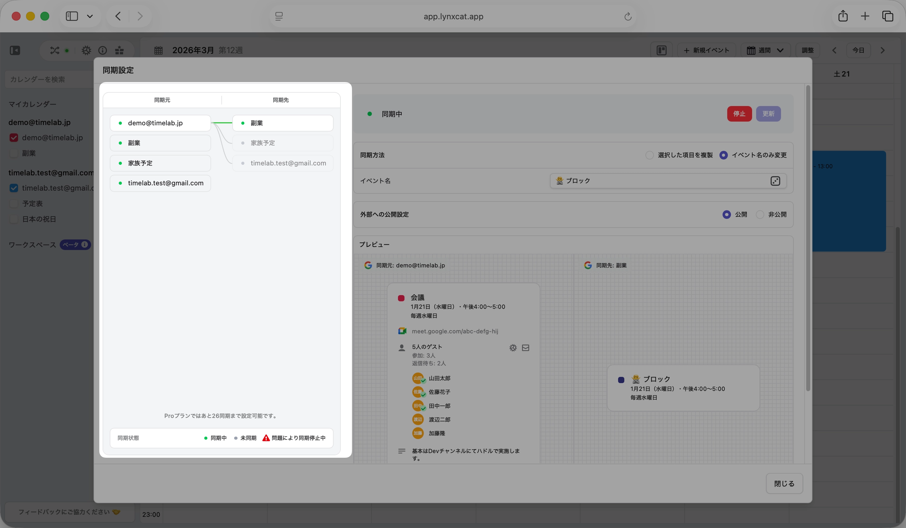 左側に同期元のカレンダーリストが表示され、どのカレンダーがどのカレンダーに同期しているかが視覚的に把握できるようになりました。