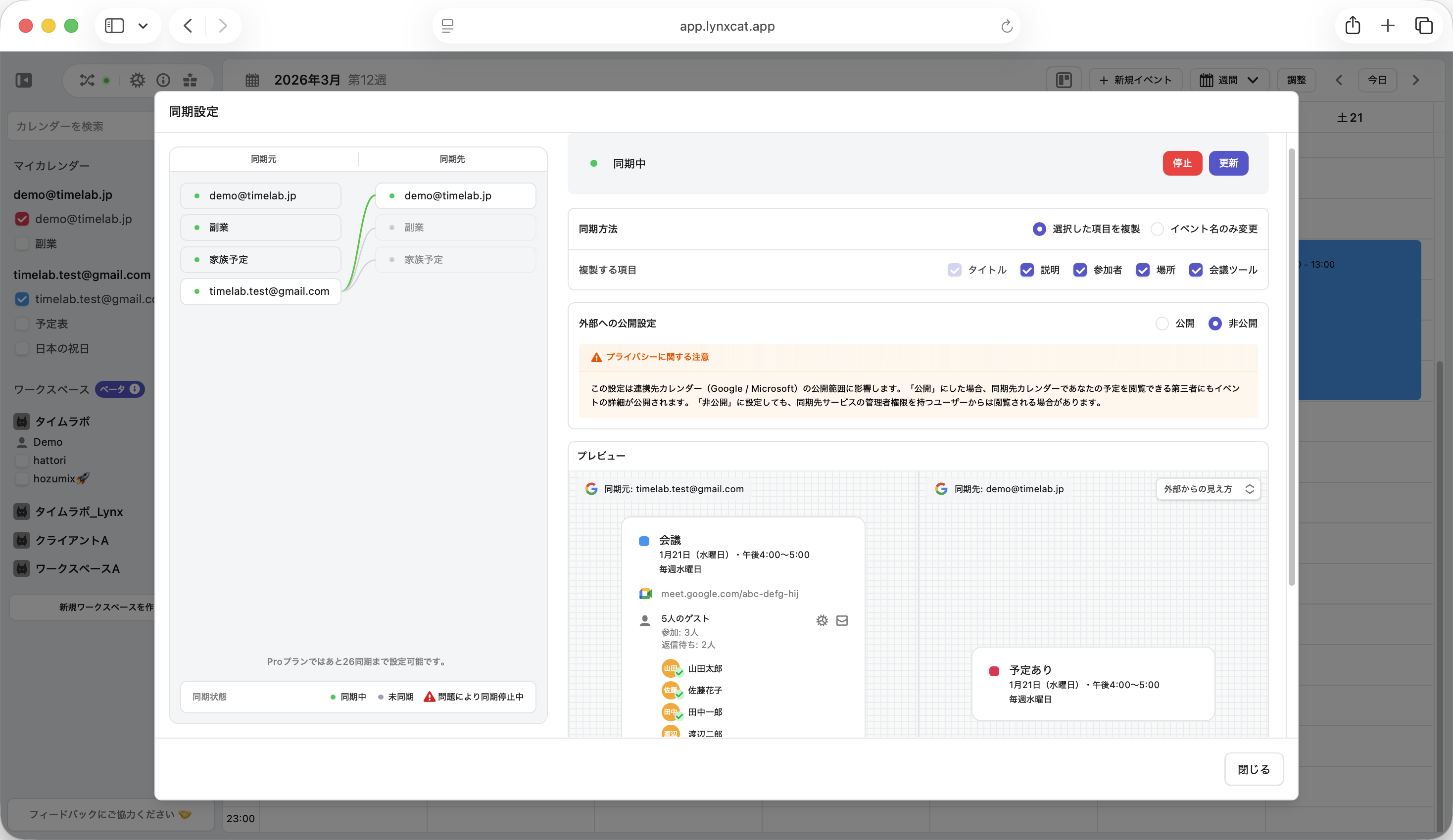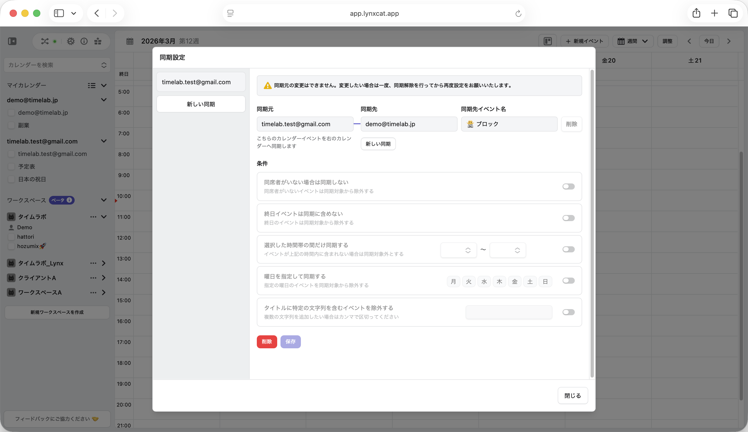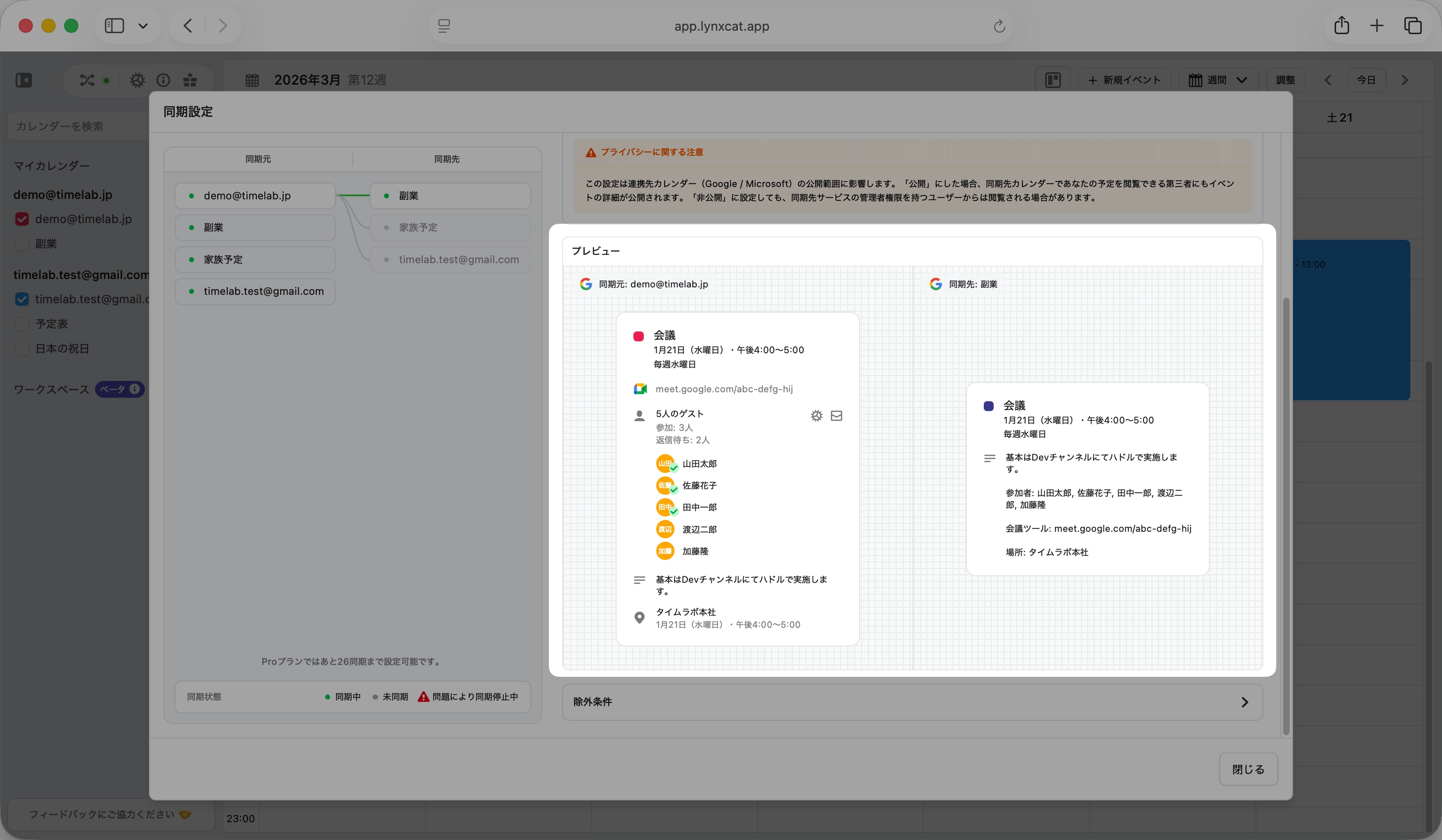 左側に同期元のカレンダーリストが表示され、どのカレンダーがどのカレンダーに同期しているかが視覚的に把握できるようになりました。