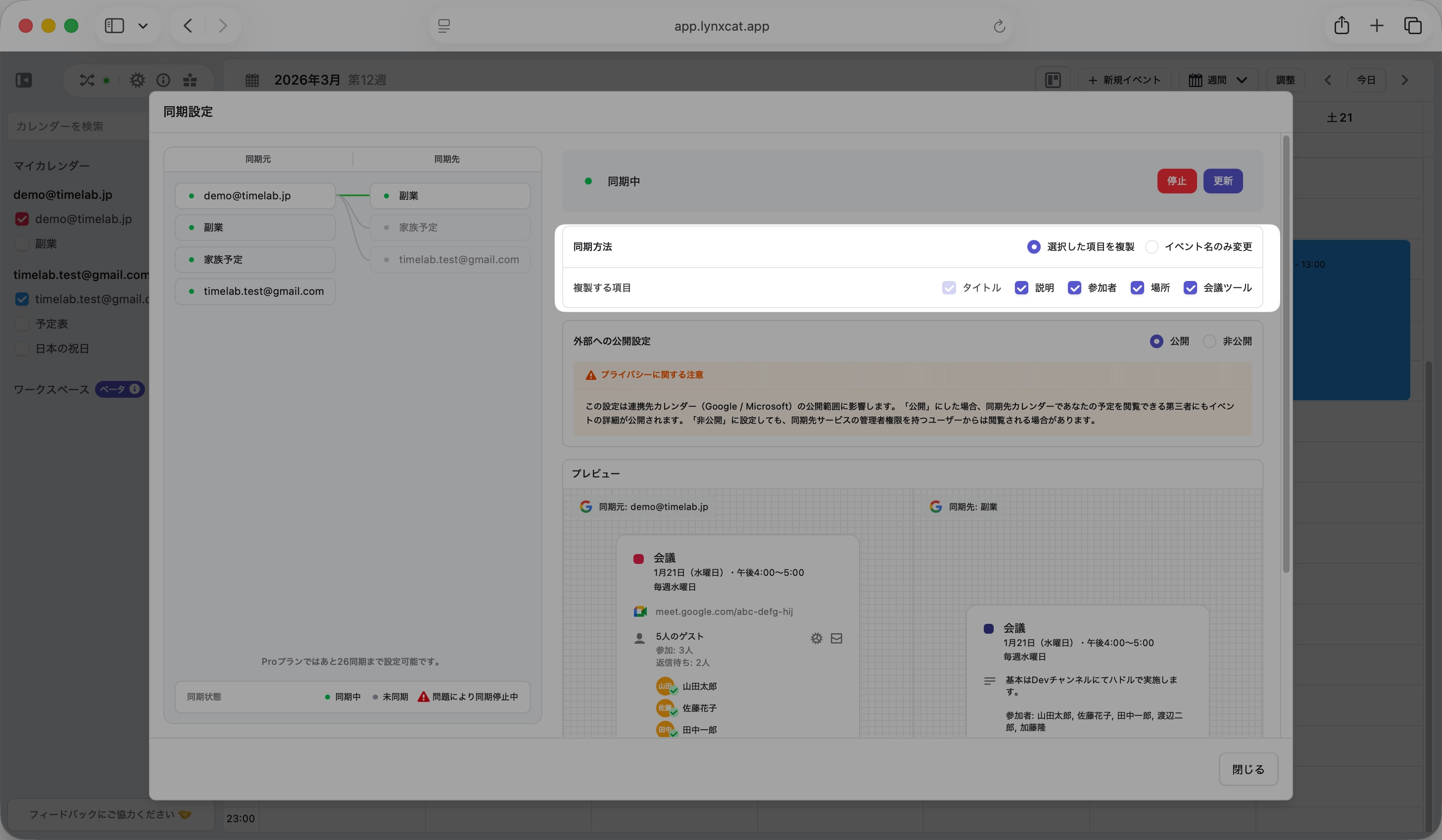 「選択した項目を複製」「イベント名のみ変更」といった同期方法の切り替えや、タイトル・説明・参加者・場所・会議ツールなど複製する項目をチェックボックスで選択できるようになりました。